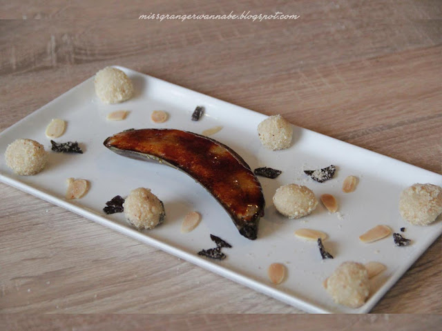 Sambil menunggu rebusan dumpling, kita membuat Banana Brulee-nya. Pisang yang telah dibelah lalu ditaburi dengan gula di atasnya. Lalu bagian yang diberi gula langsung dibakar sampai sedikit hangus.