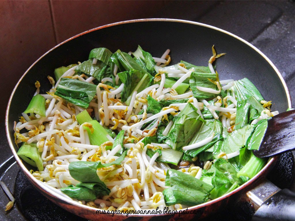 Cara membuatnya sangat gampang, dimulai dari memasak sayurannya sehingga layu. Di sini saya menumis sebagian bawang putih dahulu sampai wangi, lalu masukan juga bawang bombay, taoge, dan sayuran.
