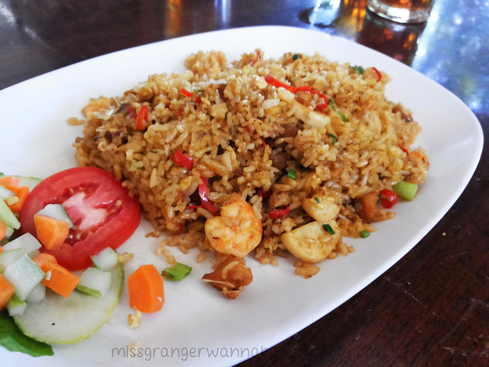 Menu ketiga yang dicoba dari KK adalah Nasi Goreng Ikan Asin seharga Rp 23.000,-. Untuk ukuran nasi goreng rasanya standar, walaupun cukup bikin ngenyangin juga karena ada potongan udang dan baksonya ternyata.