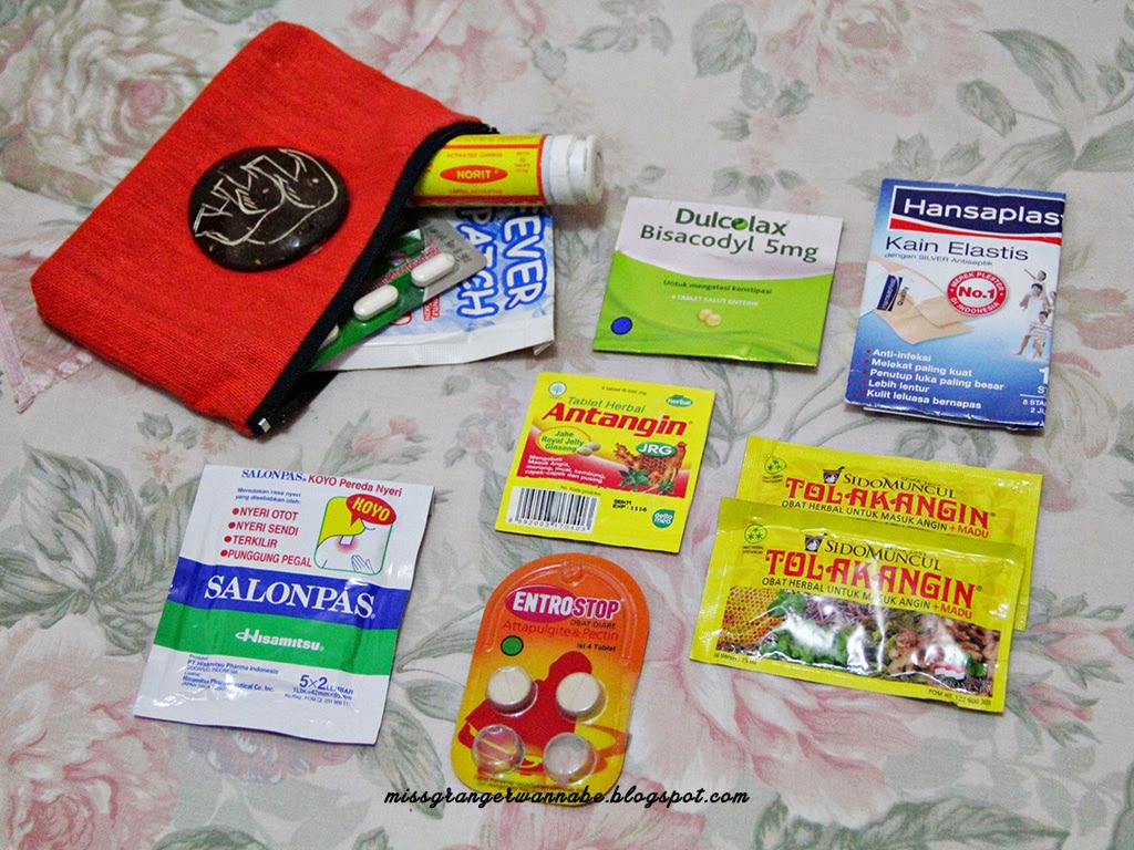 Yang ini juga gak kalah penting. Saya ngerasa kadang saya suka tiba-tiba gak enak badan, khususnya masuk angin! Sisanya macem-macem obat untuk macem-macem penyakit kayak obat buang air, pusing, koyo, bahkan hansaplast juga wajib buat saya yang sering banget ngasih “oleh-oleh” luka di kulit.