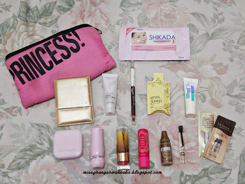 Dompet, dompet kecil (untuk uang receh), antiseptik, cologne, permen, kunci rumah, bolpoint, rol rambut, dan tentunya minyak angin! Masing-masing ada fungsinya, jadi kayaknya gak berani ada yang saya rela keluarin dari tas deh huhuhuhu…