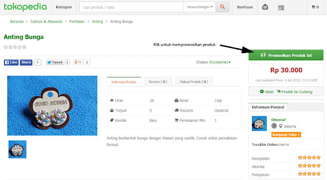 Ada berbagai cara mempromosikan produk kita. Seperti share di Facebook dan Twitter. Tapi Tokopedia juga menyediakan Menu Promosi supaya produk kita bisa berada di list produk promosi. Namun untuk member gratis hanya bisa menggunakan fitur ini 1 jam sekali untuk 1 produk.