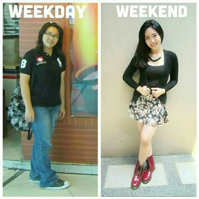 Sebaliknya, pas weekend saya bener-bener all out! Selain karena mau ketemu pacar (hihihi), sayang juga kan kalo make up sama soft lens dipakenya cuma pas kondangan aja. Hehehehe. Jadilah kalo weekend saya bisa dibilang tampil beda banget dari hari-hari biasanya.