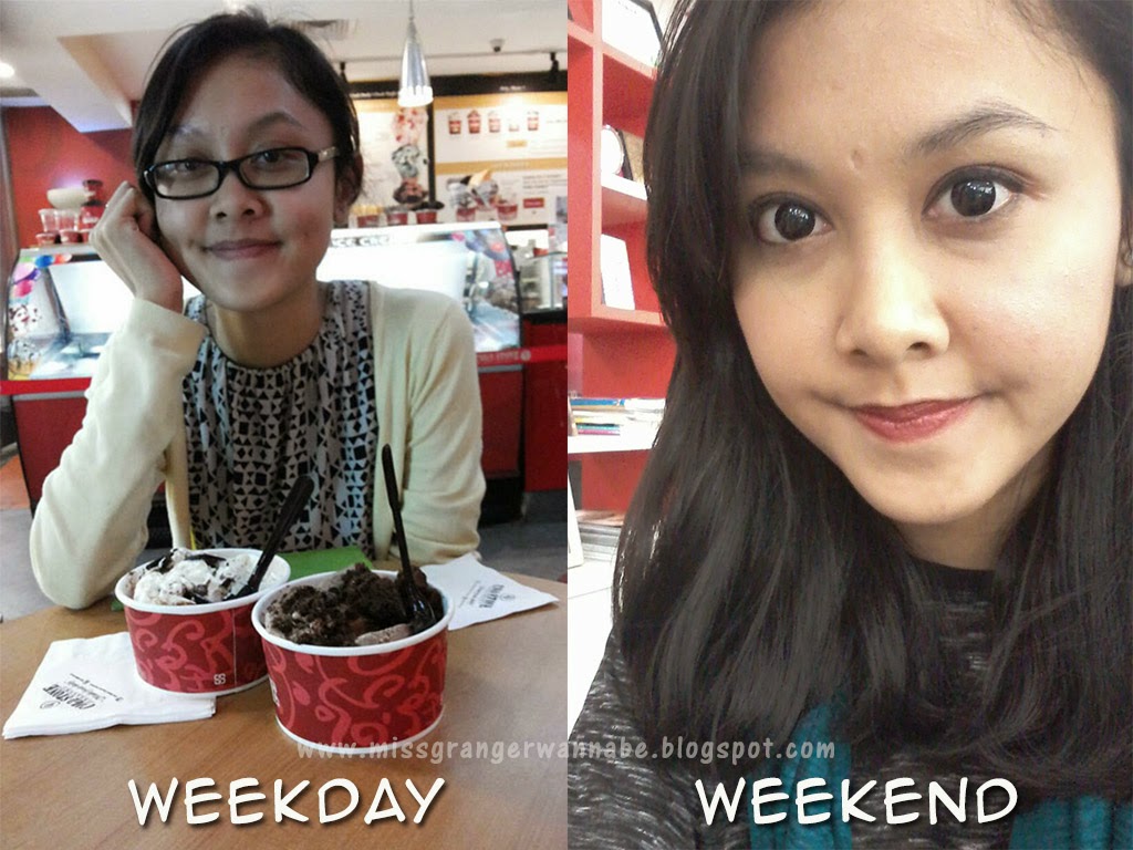 Sebaliknya, pas weekend saya bener-bener all out! Selain karena mau ketemu pacar (hihihi), sayang juga kan kalo make up sama soft lens dipakenya cuma pas kondangan aja. Hehehehe. Jadilah kalo weekend saya bisa dibilang tampil beda banget dari hari-hari biasanya.