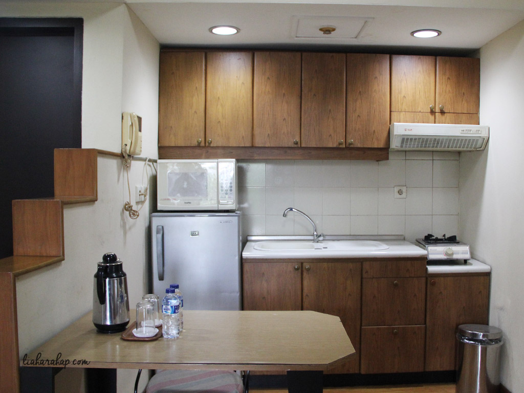 Tidak hanya tampak luarnya, ternyata di dalam kamarnya pun seperti apartemen kecil dengan satu kamar tidur, satu toilet, satu kamar mandi, dan juga ada kitchen set-nya. Kami juga tidak sampai memasak segala sih, tapi lumayan bisa pakai microwave-nya untuk menghangatkan makanan yang sudah dingin.
