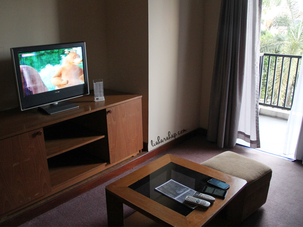 Kebetulan kamar saya menghadap ke area depan hotel. Dari jauh saya bisa melihat gedung-gedung di kota Jakarta yang tinggi. Sambil membuka jendela di balkon, saya pun duduk menikmati tayangan tv dengan channel lokal maupun internasional. Hwaaa… Pokoknya pengen relax aja, sambil lihat si Aprie asik motret sunset di balkon.